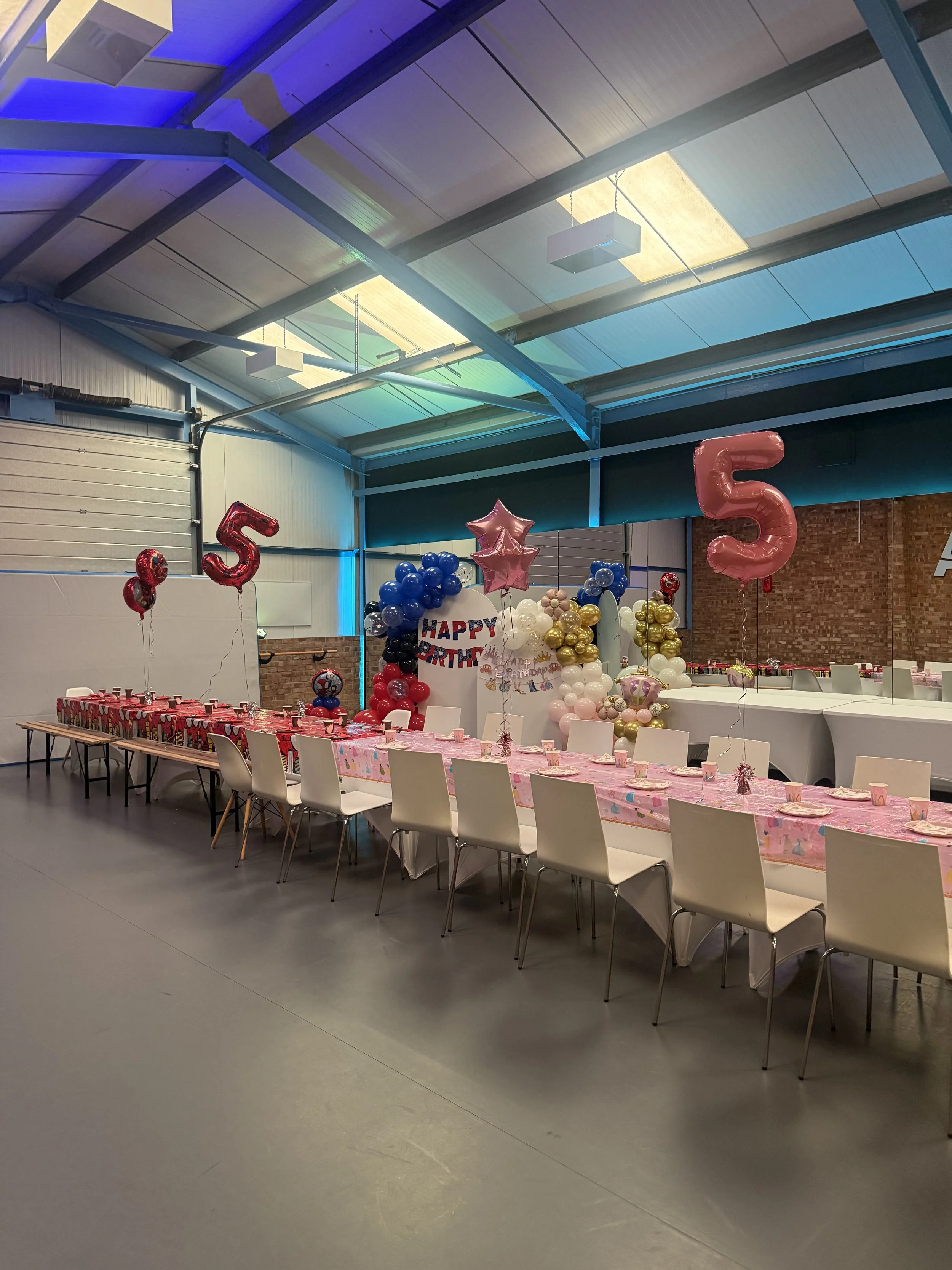 Party music throughout hire, including happy birthday, with lights turned off and disco lights in studio